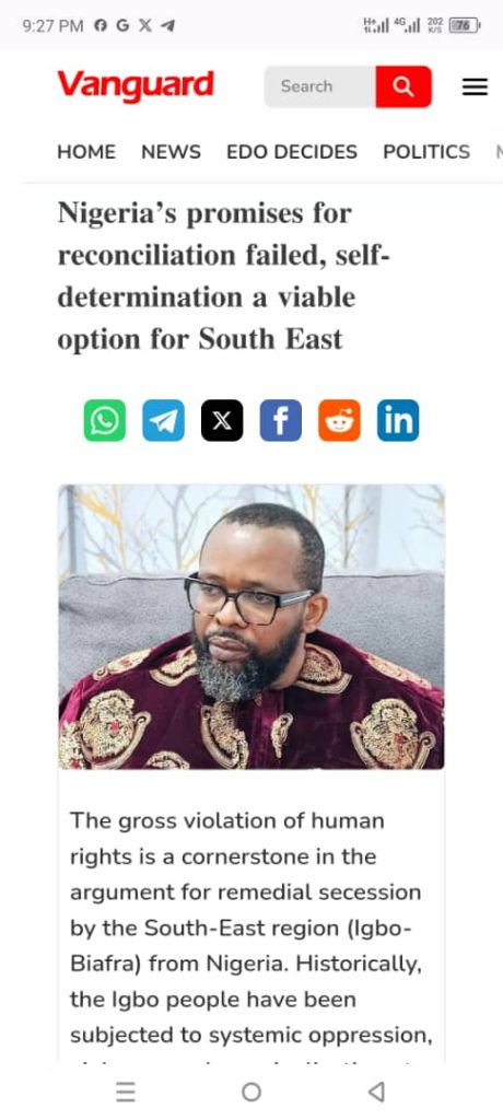 The gross human rights violations committed against the Igbo people of the South-East, both historically and in contemporary Nigeria, form a compelling case for remedial secession. The systemic discrimination, political exclusion, and state-sponsored violence faced by the South-East region not only violate Nigeria’s own constitutional principles but also contravene international human rights norms. The Nigerian government’s failure to address these grievances, despite repeated calls for reform, justifies the South-East’s demand for self-determination and independence.